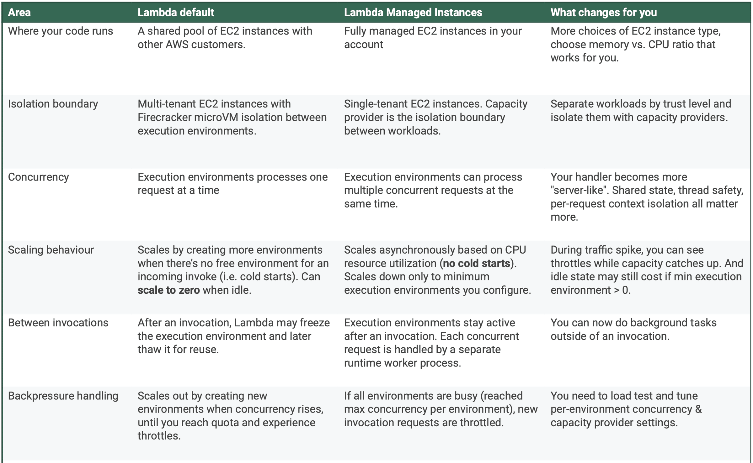 Hi, I have just finished adding some content around Lambda Managed Instances (LMI) to my upcoming workshop. I put together a cheatsheet of the important ways that LMI is different from Lambda default and thought maybe you'd find it useful too. You can also download the PDF version below. Lambda default vs. Lambda managed instances.pdf