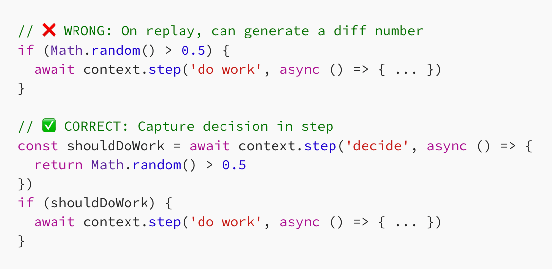 Lambda Durable Functions is a powerful new feature, but its checkpoint + replay model has a few gotchas. Here are five to watch out for. Non-deterministic code The biggest gotcha is when the code is not deterministic. That is, it might do something different during replay. Remember, when a durable execution is replayed, the handler code is executed from the start. So the code must behave exactly the same given the same input. If you use random numbers, or timestamps to make branching...