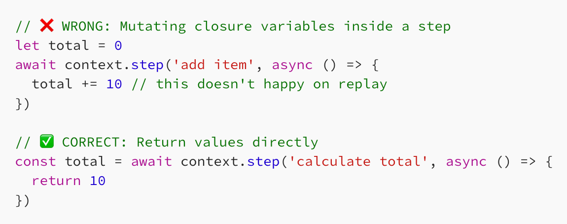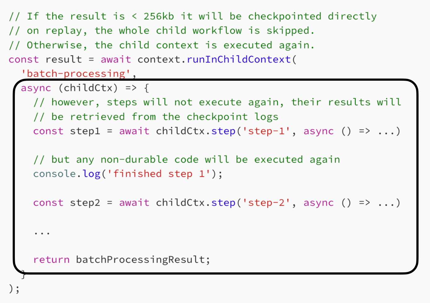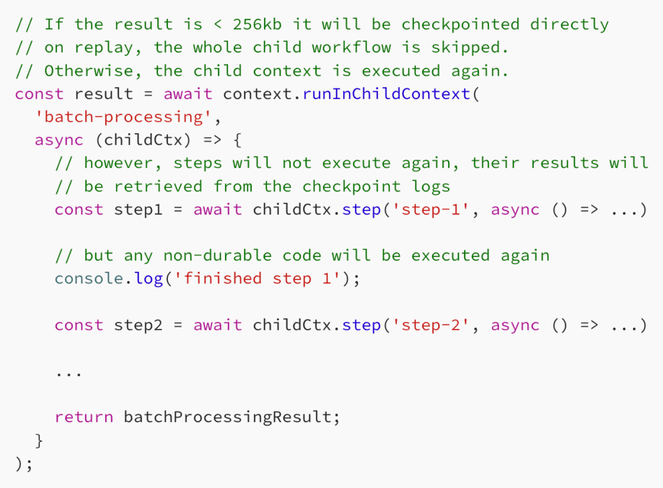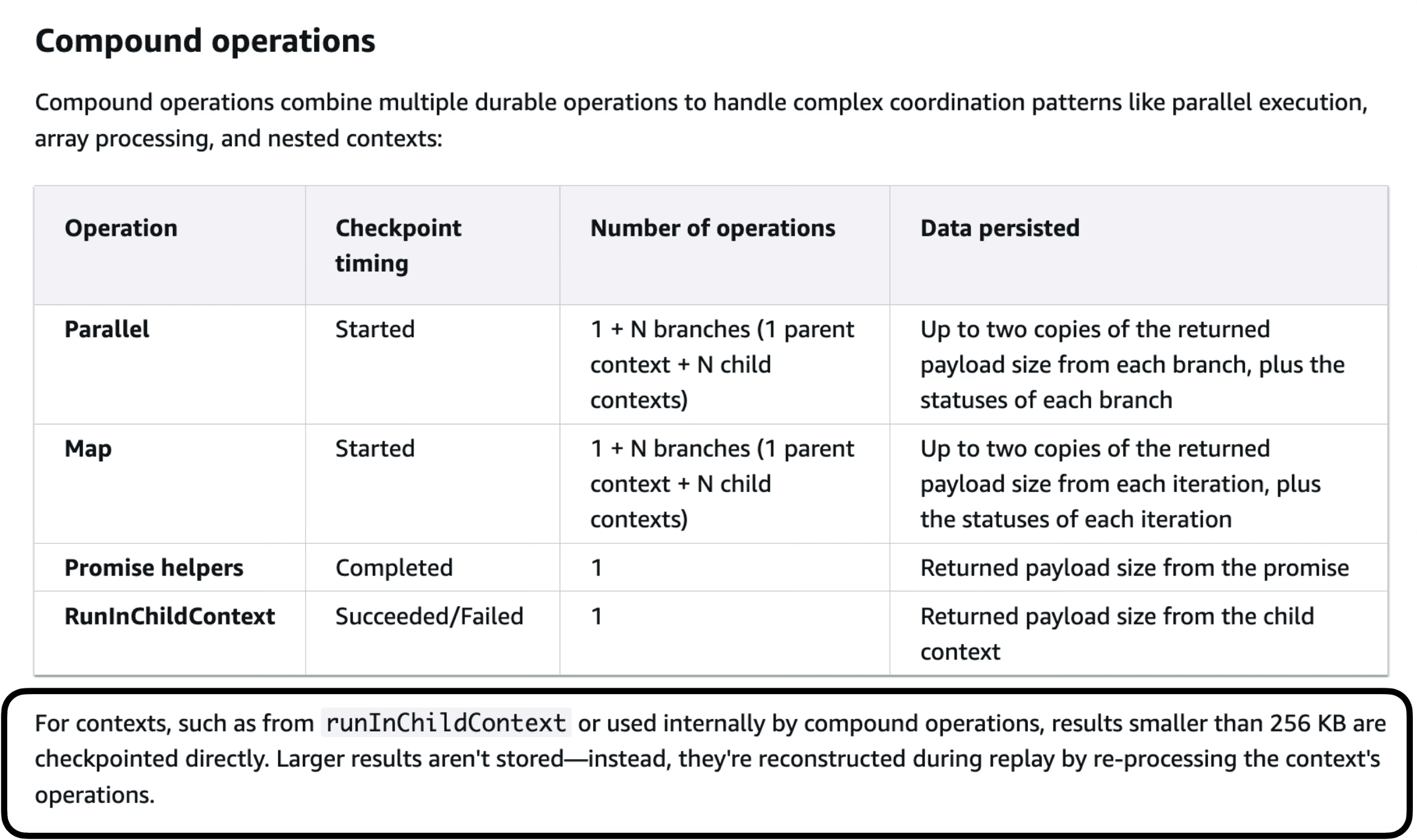 Lambda Durable Functions is a powerful new feature, but its checkpoint + replay model has a few gotchas. Here are five to watch out for. Non-deterministic codeThe biggest gotcha is when the code is not deterministic. That is, it might do something different during replay. Remember, when a durable execution is replayed, the handler code is executed from the start. So the code must behave exactly the same given the same input. If you use random numbers, or timestamps to make branching decisions. Then during a replay, the code might do something different! This is why, you should capture the branching decision in a step instead. So, during a replay, the previous decision is retrieved from the checkpoint logs. Side-effecting code outside stepYou should avoid causing side effects (e.g. updating databases, calling external APIs, sending emails) outside steps. This is to avoid causing the same side effects again during a replay. Mutate closure variablesAvoid mutating variables that are captured in the closure, inside a step. Because these mutations will be skipped during a replay, leading to non-deterministic behaviour. Dynamic step namesAvoid dynamic names for durable operations. During replay, you get a different step name to the original invocation, so the system won't be able to fetch the stored result from the checkpoint. Child context results > 256kb are reconstructed during replayYou are working with child contexts whenever you use the "runInChildContext", "parallel" or "map" operations. If a child context’s result is greater than 256kb, then it’s not stored directly. During a replay, its result is instead reconstructed by executing the context's operations again. This is mentioned in small print in the official documentation. Take the following code as example: If its result is less than 256kb, then it's stored in the database. On replay, the result is fetched and the whole child context is skipped. However, if the result is bigger than 256kb, then it's not saved. On replay, the child context, and therefore this block of code, will be executed again. The previous durable operations ("step-1" and "step-2") will be skipped. But any non-durable code will be executed again. This interplays with the previous gotchas. For example, during a replay, side-effecting actions outside of a step might be executed again if the encompassing child context is re-evaluated. Ok, that's five gotchas of working with Lambda Durable Functions. Personally, I'm very excited about Durable Functions and it's something that we're covering in the latest Production-Ready Serverless workshop. In week 3 of the workshop, you will implement the same order processing workflow using an event-driven approach, vs. Step Functions, vs. using Durable Functions. So we can discuss the pros & cons of each approach. It's still not too late to join us. Registration closes this Sunday, 18th January. |