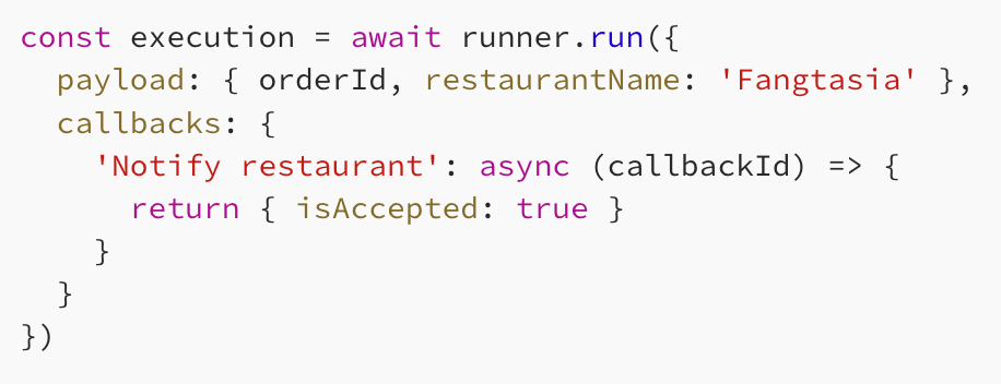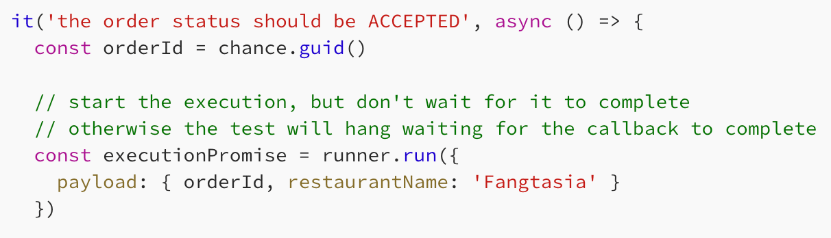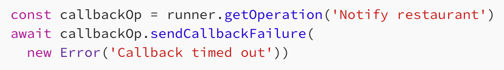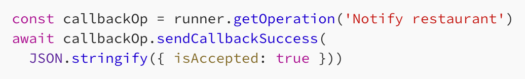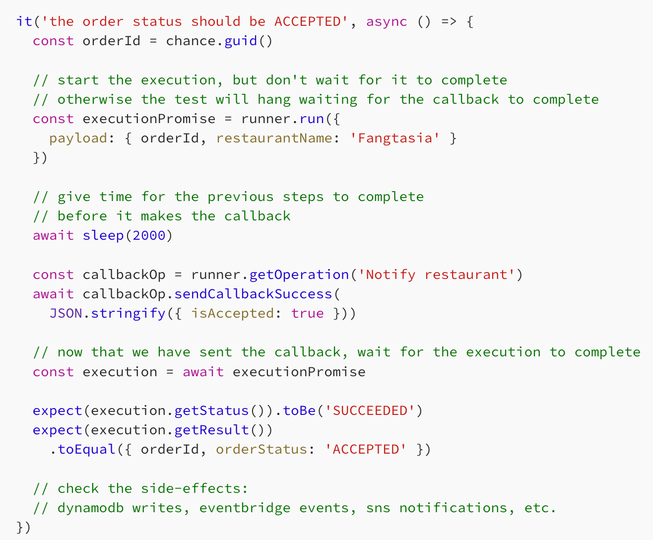 The test codeThe first challenge with testing callbacks is that, if you follow all the online examples with: Then the execution will hang as it waits for the callback. Unfortunately, setting "skipTime" to true doesn't help here. Because it only applies to wait operations, not callbacks. Instead, you must start the execution and let it run in the background (without awaiting). For example... The next challenge is that, if you try to fetch the "Notify restaurant" callback operation right away, it might not be available yet. This might be because the preceding operations have not completed yet. In that case, the following lines to fetch the "Notify restaurant" operation will throw an error. If that's the case, you might have to wait a bit and let the execution reach the "Notify restaurant" step first. Here's what that might look like. So that covers the test cases for the restaurant accepting and rejecting the order. But what about the timeout path? We wouldn't want to wait 10 mins for the callback to timeout naturally. In this specific case, where: