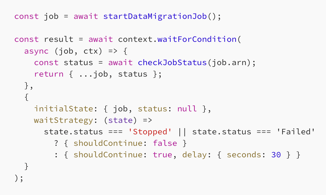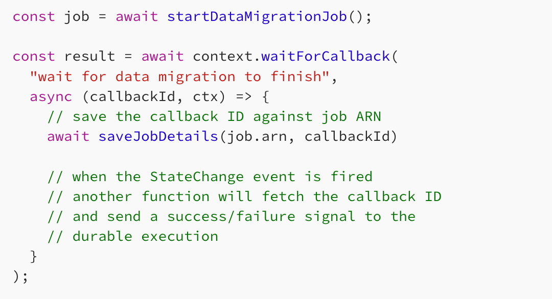 This is a more efficient but also more complex approach. There are more moving parts involved, but it's simple to implement. But what if you're calling a 3rd party API that do not support events? You can adapt this approach to work with any service that accept a callback URL. When the 3rd party service makes the callback, your API handler will look up the task token and make the callback to Step Functions. Everything else stays the same as before. What's more, both the polling and event-driven approach can be implemented with the new Lambda Durable Functions too! The waitForCondition operation is perfect for implementing the polling loop in just a few lines, like this: Similarly, the waitForCallback operation makes implementing the event-driven approach trivial. Instead of a task token, we have to store a callback ID. As before, the callback can be triggered by an event or by a 3rd party service via a callback URL. Polling is the default because it’s easy, not because it’s good. If you can get an event (or a callback), you can stop spinning your state machine and start treating "waiting" as a first-class step. Less noise, fewer transitions, lower cost. Thank you to Patrick for bringing this up in our last Q&A session. If you want to level up your AWS game, check out my Production-Ready Serverless workshop. The next cohort starts on April 13th, and the early bird tickets (30% off) is available until March 16th. Until then, ciao! |
