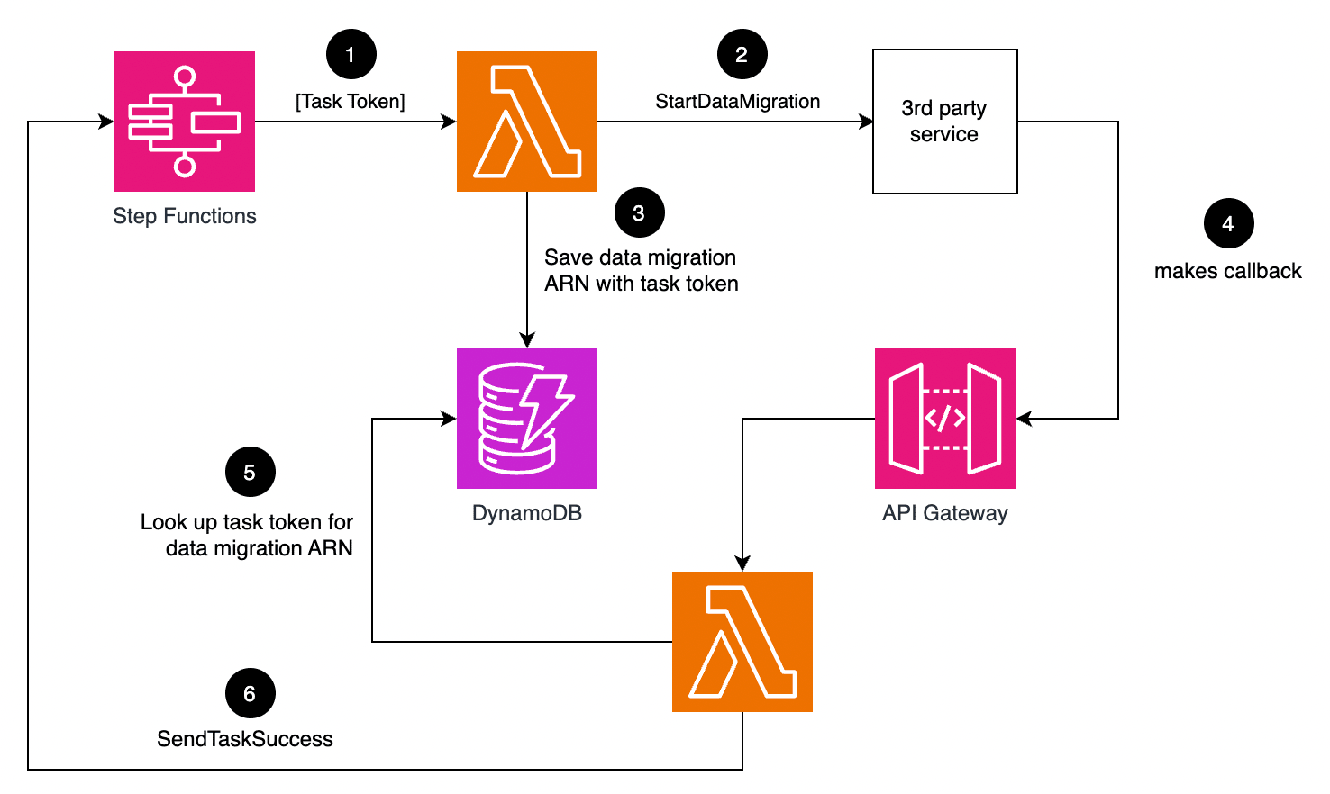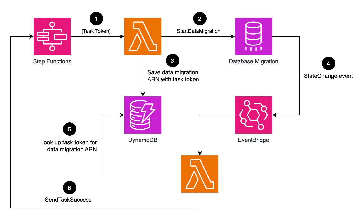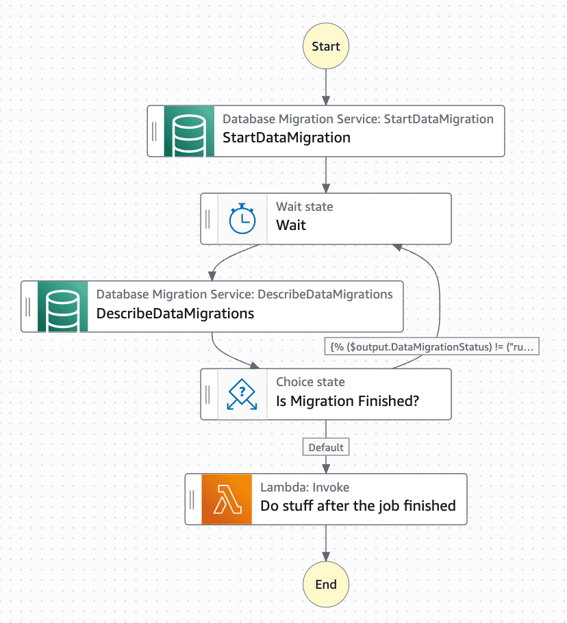 Step Functions is often used to poll long-running processes, e.g. when starting a new data migration task with Amazon Database Migration. There's usually a Wait -> Poll -> Choice loop that runs until the task is complete (or failed), like the one below. Polling is inefficient and can add unnecessary cost as standard workflows are charged based on the number of state transitions. There is an event-driven alternative to this approach. Here's the high level approach: